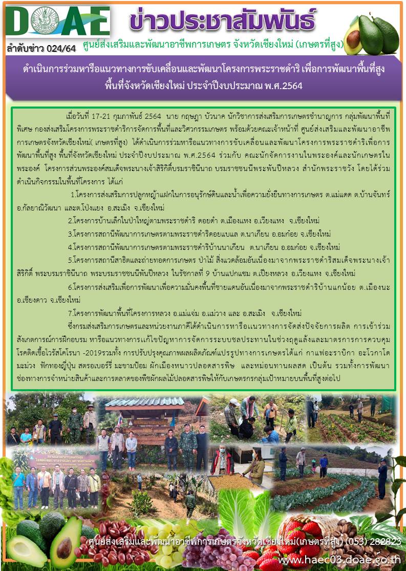 เมื่อวันที่ 17-21 กุมภาพันธ์ 2564 นาย กฤษฎา บัวนาค นักวิชาการส่งเสริมการเกษตรชำนาญการ กลุ่มพัฒนาพื้นที่พิเศษ กองส่งเสริมโครงการพระราชดำริการจัดการพื้นที่และวิศวกรรมเกษตร พร้อมด้วยคณะเจ้าหน้าที่ ศูนย์ส่งเสริมและพัฒนาอาชีพการเกษตรจังหวัดเชียงใหม่( เกษตรที่สูง) ได้ดำเนินการร่วมหารือแนวทางการขับเคลื่อนและพัฒนาโครงการพระราชดำริเพื่อการพัฒนาพื้นที่สูง พื้นที่จังหวัดเชียงใหม่ ประจำปีงบประมาณ พ.ศ.2564 ร่วมกับ คณะนักจัดการงานในพระองค์และนักเกษตรในพระองค์ โครงการส่วนพระองค์สมเด็จพระนางเจ้าสิริกิติ์บรมราชินีนาถ บรมราชชนนีพระพันปีหลวง สำนักพระราชวัง โดยได้ร่วมดำเนินกิจกรรมในพื้นที่โครงการ ได้เเก่
